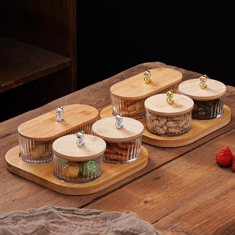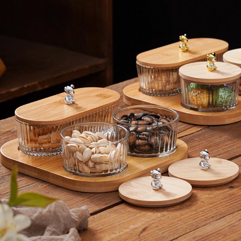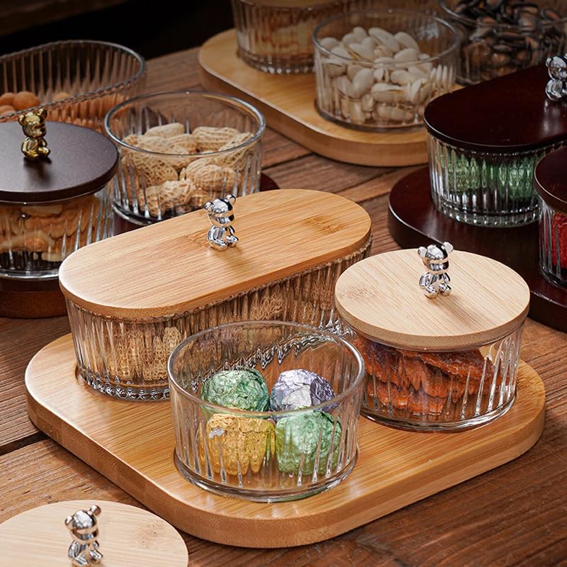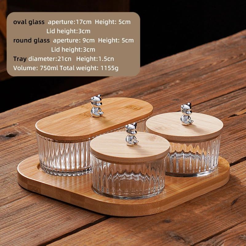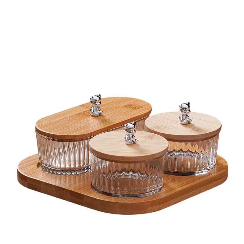 Next store - طقم زجاجي للتسالي والمكسرات من Next store بغطاء خشب مع ستاند خشبي أنيق بمقبض تصميم فاخر يناسب المطبخ والضيافة للحفاظ على الطعم والنكهة-3 قطع (بيج)