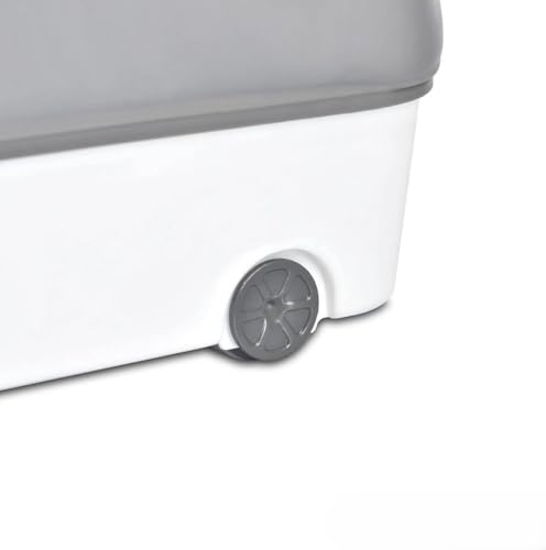 - عجلات لسهولة الحركة والنقل: يحتوي الجزء السفلي على عجلات صغيرة مدمجة وانسيابية تسمح بدفع وتحريك الصندوق بسلاسة ويسر على الأرضيات حتى عندما يكون ممتلئاً بالأغراض، مما يسهل عملية التنظيف تحته أو تغيير مكانه.