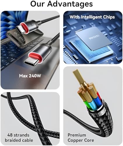 - [قدرة شحن فائقة]: يدعم الكابل قدرة شحن تصل إلى 240W لتلبية احتياجاتك المتنوعة بكفاءة عالية. سواء كنت تشحن هاتفك، جهازك اللوحي أو اللابتوب، ستحصل على أداء سريع وآمن. بفضل تصميمه الذكي، يحافظ على استقرار التيار الكهربائي، مما يحمي أجهزتك من المخاطر المحتملة ويوفر تجربة شحن موثوقة كل مرة.