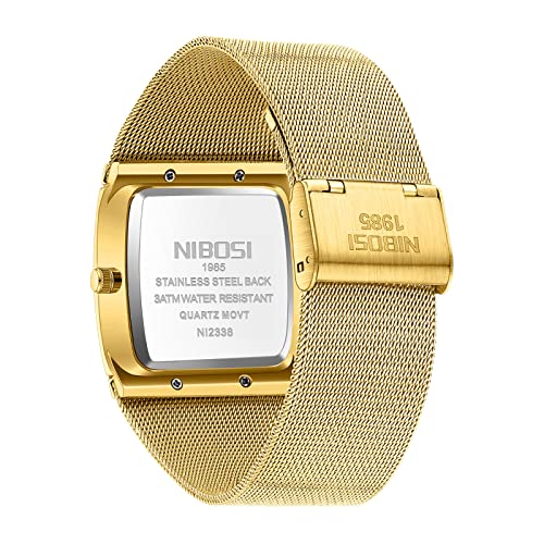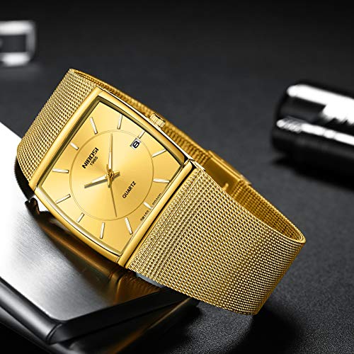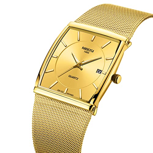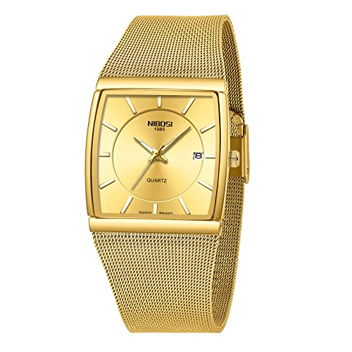 NIBOSI - نيبوسي ساعات للرجال بتصميم بسيط شبكي من الستانلس ستيل مربع الاعمال معصم انالوج كوارتز مقاومة للماء مع تقويم للتاريخ لون ذهبي