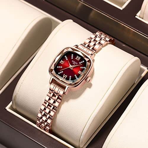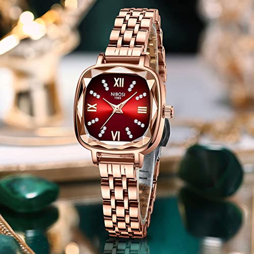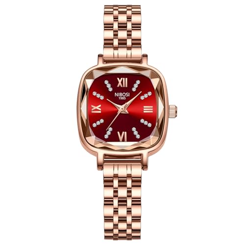NIBOSI - نيبوسي ساعة انالوج بعقارب ومينا مربع بلون ذهبي وردي للنساء والبنات والسيدات مرصعة بالماس مع ساعات انيقة مقاومة للماء، احمر