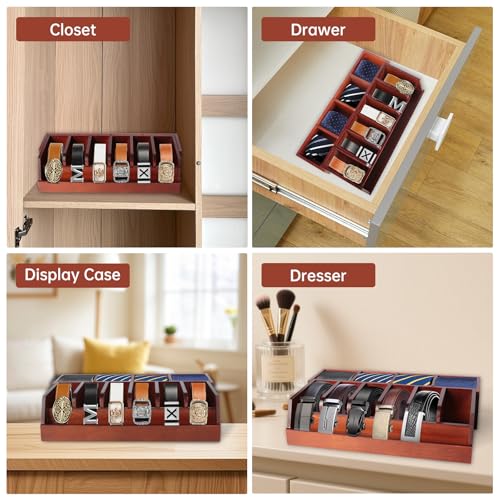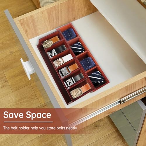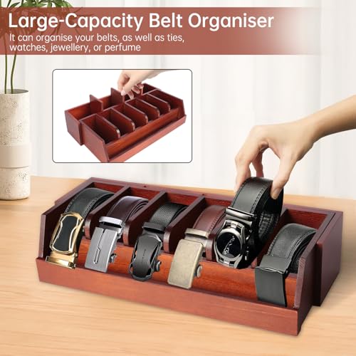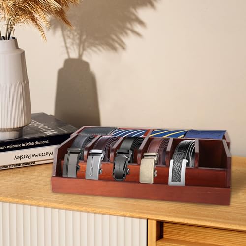 - 🌈منظم أحزمة متعدد الوظائف: إذا كنت بحاجة إليه، يُعد منظم الأحزمة الخشبي صندوق تخزين ممتاز لأحزمتك والكرافتات واكسسواراتك الأخرى. تُستخدم المقصورة الأمامية لتخزين الأحزمة، بينما تحتوي المقصورة الخلفية على أربع مقصورات صغيرة مع فواصل قابلة للإزالة، مما يتيح لك تخزين الكرافتات والعطور والنظارات أو الاكسسوارات الصغيرة الأخرى، بحيث لا تضيع أغراضك بسبب وضعها عشوائيًا.