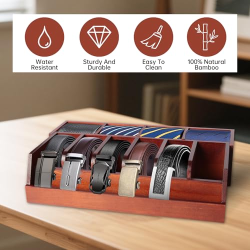 - 🌈مادة عالية الجودة: منظم الأحزمة مصنوع من البامبو الطبيعي، وهو صديق للبيئة ومتين ومقاوم للرطوبة. صندوق تخزين أنيق وعملي مع حواف مصقولة ناعمة وخالية من النتوءات.
