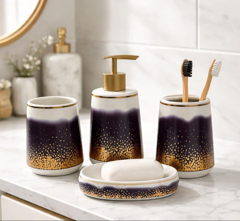 - طقم السيراميك "ميدنايت جولد" المكون من 4 قطع. يتميز هذا الطقم بتدرج لوني سلس من العاجي إلى الداكن، مع نقاط ذهبية دقيقة وحواف ذهبية أنيقة، ليضفي على حمامك لمسة عصرية راقية.