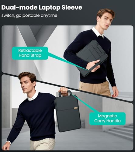 - [مقبض مغناطيسي وحزام قابل للسحب ثنائي الأغراض] - تأتي الحافظة مع مقبض مغناطيسي - يمكنك الإمساك بها بسهولة للتنقل أو الرحلات أثناء التنقل، وتتراجع تلقائيًا عبر المغناطيس عند عدم استخدامها لتبقى أنيقة. على جانب حافظة اللابتوب، يضيف الحزام القابل للسحب ثنائي الأغراض متعدد الاستخدامات: استخدمه للإمساك الآمن بيد واحدة أثناء الحركة، أو قم بتمديده كمثبت مضاد للانزلاق عند استخدام اللاب توب لمنعه من الانزلاق باستمرار