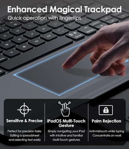 - 【انقر فوق لوحة التحكم باللمس في أي مكان】جراب مزود بمقبض ولوحة مفاتيح لجهاز اي باد، يحتوي على معالج سداسي النواة يشبه الموجود في أجهزة الموبايل المتطورة، وتوفر لوحة اللمس تجربة سلسة بشكل ملحوظ. يدعم جميع إيماءات ابل ليصبح تصفح جهازك طبيعة ثانية. يحتوي على لوحة تحكم باللمس أكبر بنسبة 30% من (العلامات التجارية المشهورة) مما يوفر لوحة واسعة للتحكم.