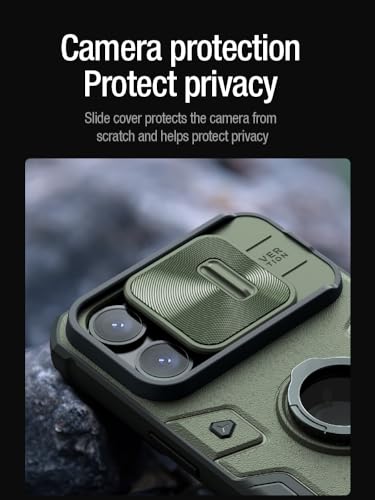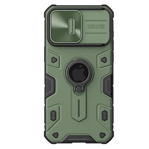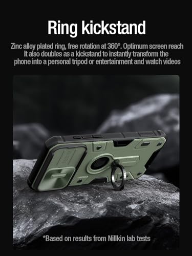 Nillkin - جراب حماية خلفي ارمور صلب من نيلكن بحماية للكاميرا وحامل إصبع معدني وغطاء كاميرا متحرك لموبايل ابل ايفون 15 برو- أخضر غامق