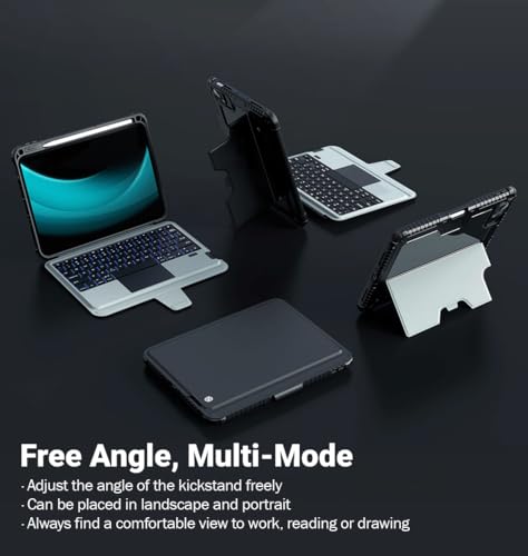 - 【زاوية حرة وأوضاع متعددة】يوفر المسند إمكانية التعديل من 0 إلى 180 درجة ويتيح استخدام الجهاز في وضع أفقي أو عمودي ويتميز بتصميم ثابت ومتين ويتيح العثور على الزاوية المثالية للعمل أو التصفح أو مشاهدة الفيديو أو الكتابة أو الرسم. يمكن فصل لوحة المفاتيح بسهولة للاستمتاع بالرسم أو اللعب.