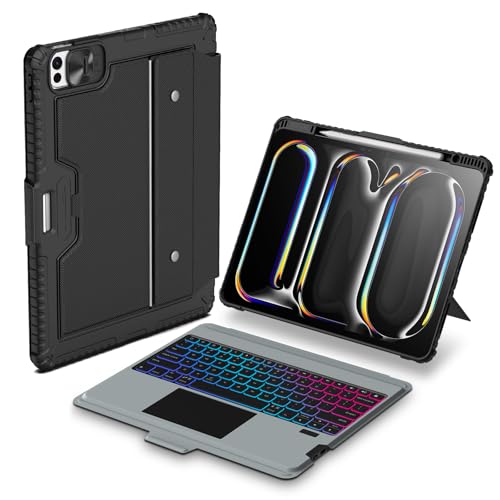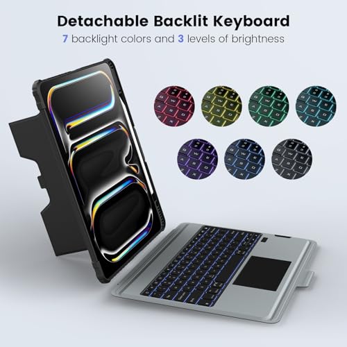 - حافظة بلوحة مفاتيح وإضاءة خلفية ولوحة تحكم باللمس بتقنية مضادة للخطأ - حافظة اي باد برو 13 بوصة مع كيبورد بإضاءة خلفية قابلة لإعادة الشحن وإضاءة خلفية بـ7 ألوان و3 مستويات لضبط السطوع، حيث يمكنك استخدام جهاز اي باد بسهولة حتى في البيئة المظلمة. حافظة اي باد برو 13 مع لوحة مفاتيح هادئة ومريحة للكتابة ولوحة تحكم باللمس مدمجة عالية الحساسية للتمرير والتنقل باللمس وأكثر من ذلك. تتميز بلوحة تحكم باللمس بتقنية مضادة للخطأ للتخلص من متاعب تشتيت المؤشر أثناء الكتابة.