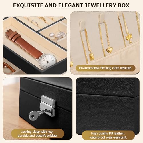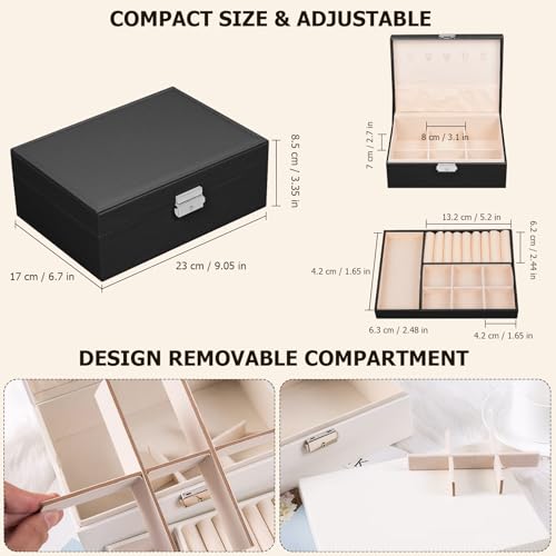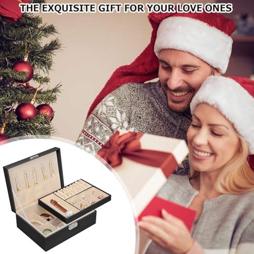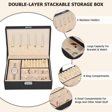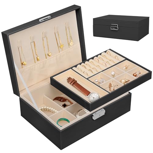 Ninonly - صندوق منظم مجوهرات من الجلد الصناعي حافظة لتخزين مجوهرات من طبقتين للأقراط والأساور والخواتم والساعات من نينونلي، أسود