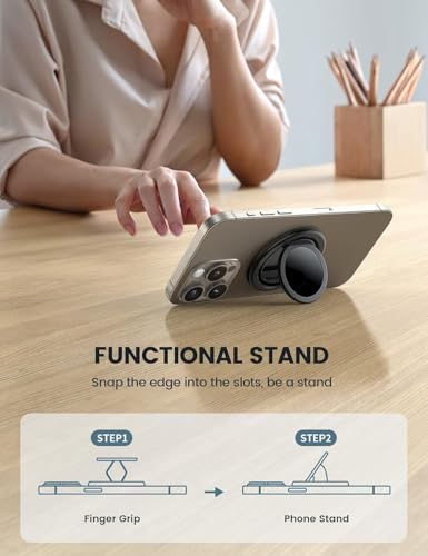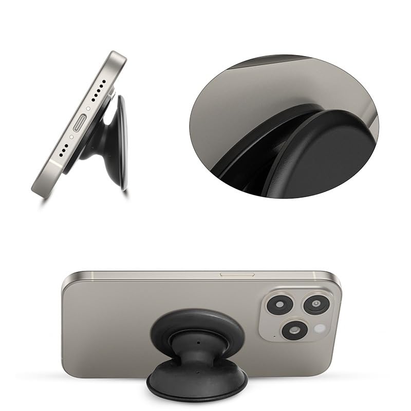 - حامل مرن يدور 360 درجة: يتميز مقبض الموبايل المغناطيسي هذا بتصميم دوران داخلي سلس 360 درجة، حتى تتمكن من ضبطه وتدويره حسب زاوية العرض المطلوبة أو الإمساك دون الحاجة إلى إزالته! للعمل كحامل للموبايل، ما عليك سوى وضع حافة مقبض الموبايل مع الفتحة المقابلة، ثم اضغط عليه وادفعه بإحكام.