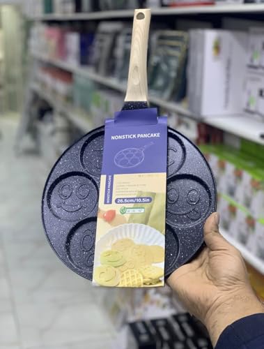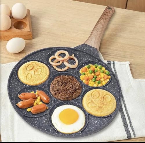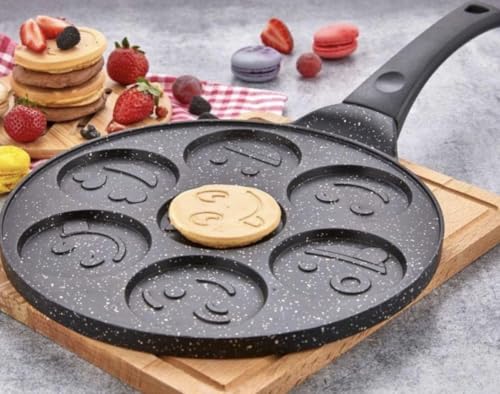 Generic - مقلاة بان كيك غير لاصقة، 7 فتحات، تصميم وجوه مبتسمة، مقبض خشبي، 26.5 سم، رمادي داكن