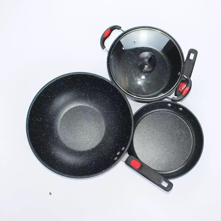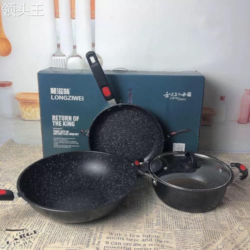 Generic - طقم أواني الطبخ مصنوع من الحديد الزهر والفولاذ الكربوني باللون الأسود، غير لاصق مع غطاء زجاجي وتوزيع حراري متميز، يتكون من 3 قطع