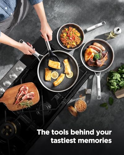 Roomena - طقم مقلاة غير لاصقة من السيراميك الهجين ثلاثي الطبقات غير سام من الستانلس ستيل 8 و10 و12 انش، خالية من PFAS/PFOA/PTFE، امنة للاستخدام في غسالة الصحون والفرن، متوافقة مع الحث