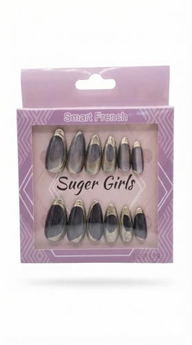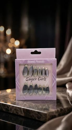 Nopatia - طقم أظافر من Nopatia صناعية 12 قطعة - تصميم "الفرنش المعدني" المبتكر بتأثير وميض خافت - أظافر لوزية عصرية للتركيب بالضغط لمظهر سهرة فاخر