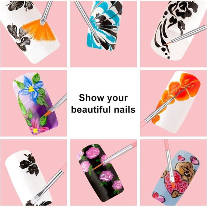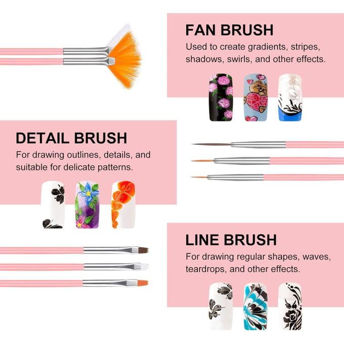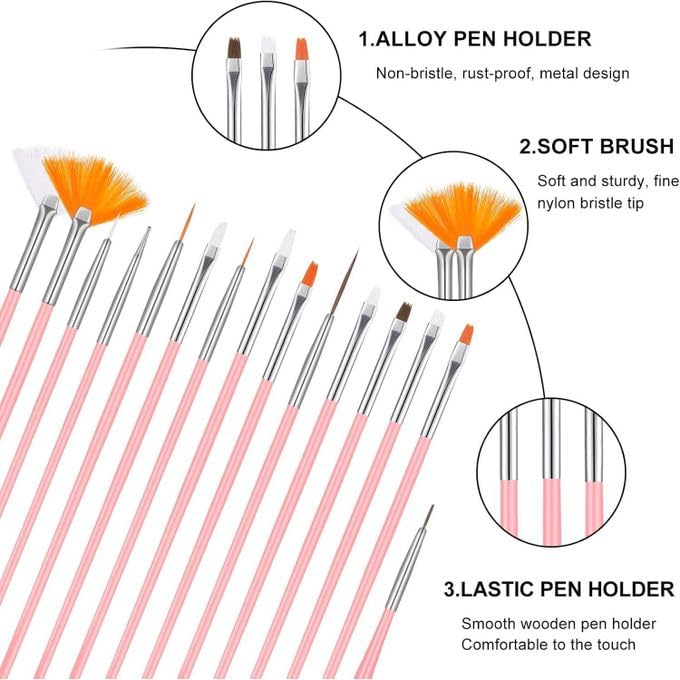 - دقة متناهية في الرسم والتنقيط: يضم الطقم أقلاماً متخصصة لعمل النقط وفرشاً برؤوس دقيقة جداً تسمح لكِ برسم أدق التفاصيل والزخارف، مما يمنح أظافركِ مظهراً احترافياً يحاكي نتائج أرقى الصالونات.