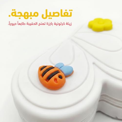 - زينة كرتونية لطيفة: تزدان الحقيبة بمجموعة من الرسومات البارزة والمحببة مثل السرعون، الوردة، والفيونكة، مما يمنحها طابعاً حيوياً ومميزاً يناسب مختلف الأذواق.