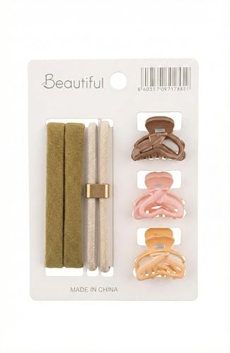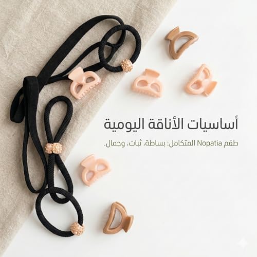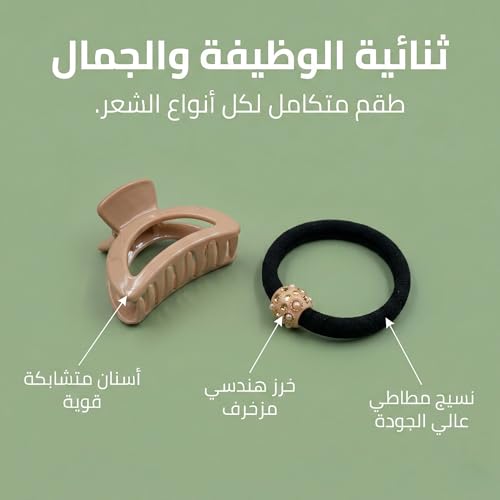 - مجموعة التصفيف المزدوجة: يجمع الطقم بين نوعين أساسيين من الإكسسوارات في باقة واحدة؛ ربطات شعر مطاطية رفيعة لتثبيت التسريحات الأساسية، ومشابك "مخلب" صغيرة (Mini Claw Clips) للتحكم في الخصلات الجانبية.