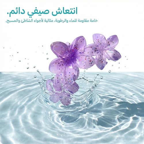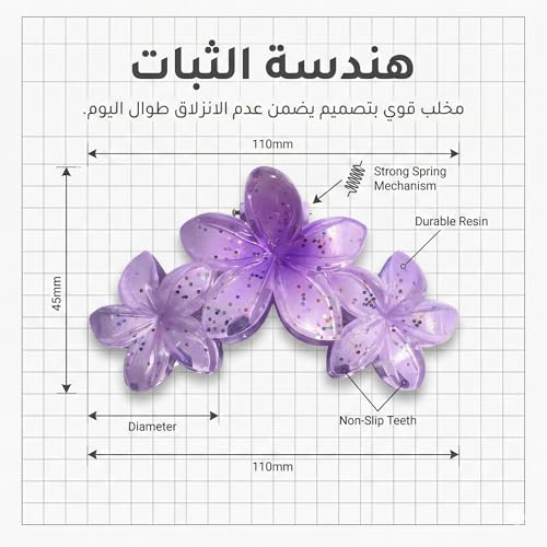 - مشبك شعر مخلب بتصميم ثلاث زهور متصلة مع جليتر لامع، يمنح إطلالتك لمسة صيفية جذابة، مثالي للشاطئ والرحلات والسهرات، ويضيف بريقًا أنيقًا يلفت الأنظار بأسلوب عصري.