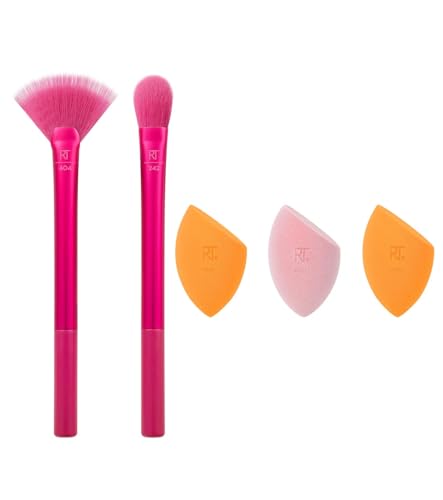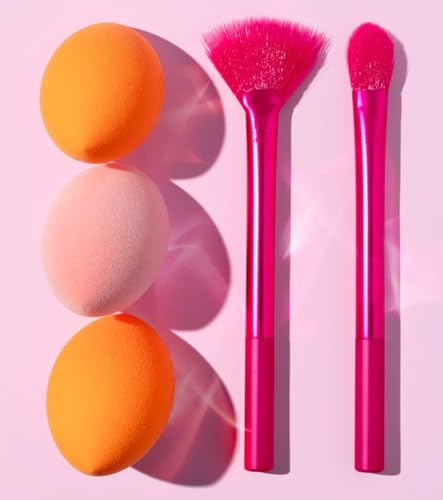 Nopatia - طقم فرش مكياج من Nopatia وإسفنجات - مجموعة هدايا 5 قطع - تتضمن فرشاة مروحة، فرشاة كونسيلر و3 إسفنجات دمج احترافية - إصدار محدود للكونسيلر والهايلايتر وكريم الأساس