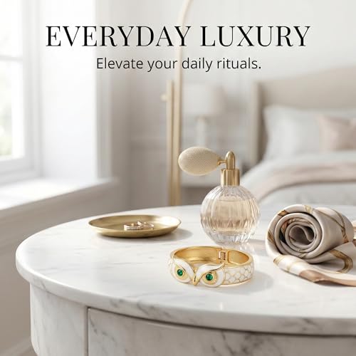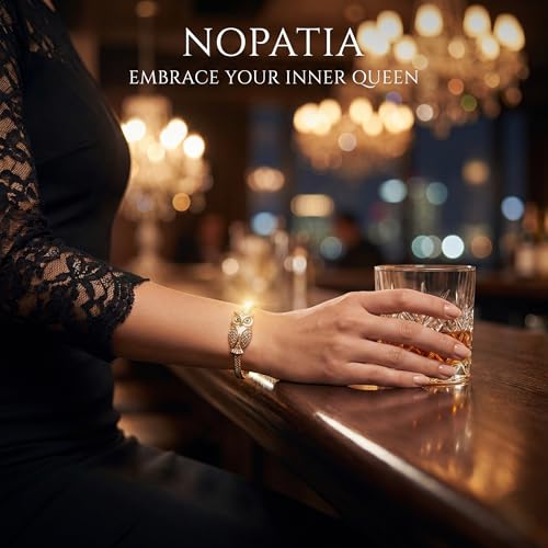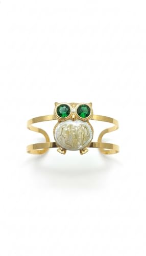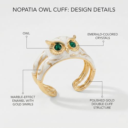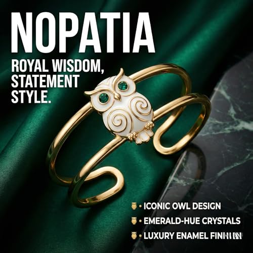 Nopatia - سوار ذهبي مفتوح بتصميم بومة ملكية من Nopatia إكسسوار يد فاخر مرصع بأحجار خضراء وتفاصيل مينا بيضاء - قطعة فريدة تبرز أناقة معصمك