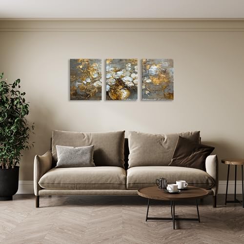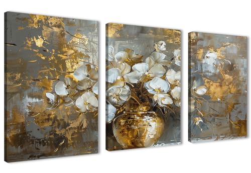 Nova Art - تابلوه كانفاس جدارية مطبوع بتصميم تجريدي تعرض مزهرية مليئة بزهور بيضاء بتفاصيل ذهبية لتزيين حائط غرفة النوم والمعيشة والمكتب وما إلى ذلك ديكور منزلي حديث من نوفا آرت ، مقاس 30 سم × 40 سم × 3 قطع