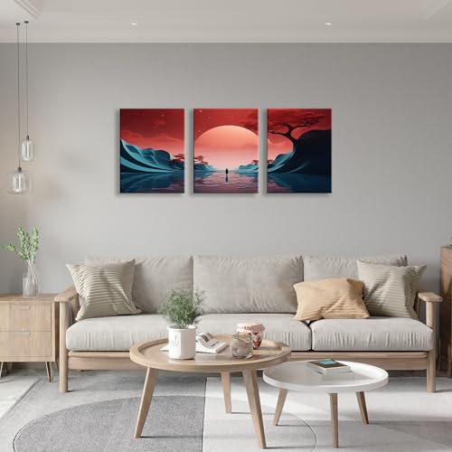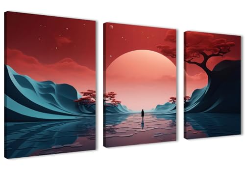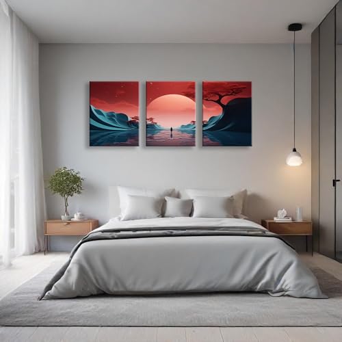 Nova Art - تابلوه كانفاس جدارية مطبوع بتصميم ضوء سماوي يتوهج في أفق أحمر، جبال متدفقة بلون الأزرق لتزيين حائط غرفة النوم والمعيشة والمكتب وما إلى ذلك ديكور منزلي حديث من نوفا آرت ، مقاس 30 سم × 40 سم × 3 قطع