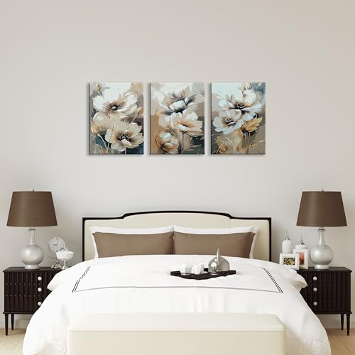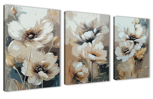 Nova Art - تابلوه كانفاس جدارية مطبوع بتصميم زهور بيضاء بتفاصيل دقيقة ولمسات من البيج والبني والذهبي لتزيين حائط غرفة النوم والمعيشة والمكتب وما إلى ذلك ديكور منزلي حديث من نوفا آرت ، مقاس 30 سم × 40 سم × 3 قطع