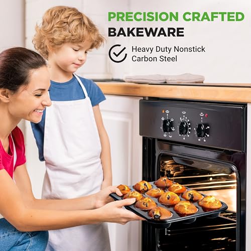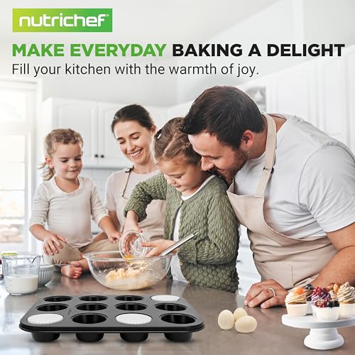 Nutrichef - صينية مافن غير لاصقة مع 100 ورقة كب كيك من ورق الزبدة مصنوعة من صلب كربوني، متينة وآمنة لغسالة الأطباق مقاس 35 × 26 × 3 سم من نيوتري، قطعتان سعة 12 كوب (أسود)