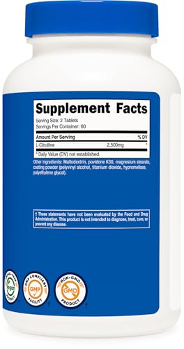 Nutricost - نوتريكوست L- سيترولاين 2500 ملغ لكل وجبة، 60 حصة، 1250 ملغ لكل قرص، 120 قرص - مكمل غذائي غير معدّل وراثيًا وخالي من الجلوتين