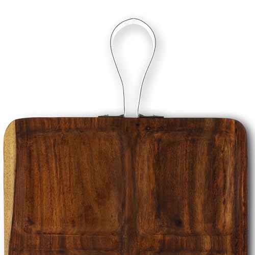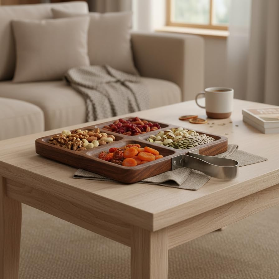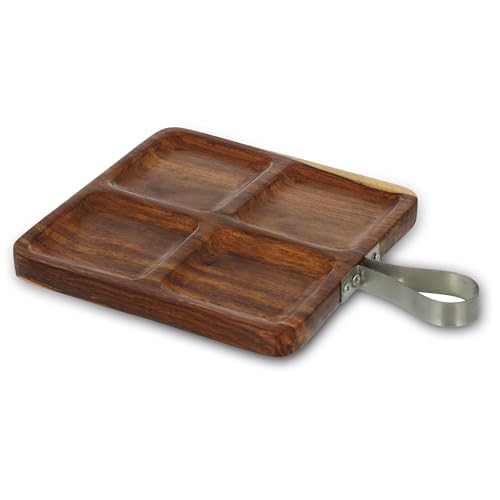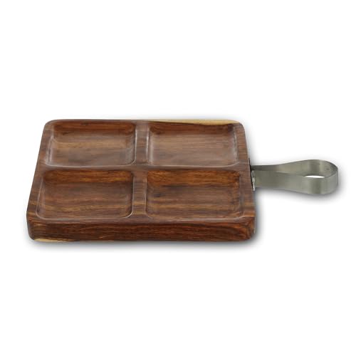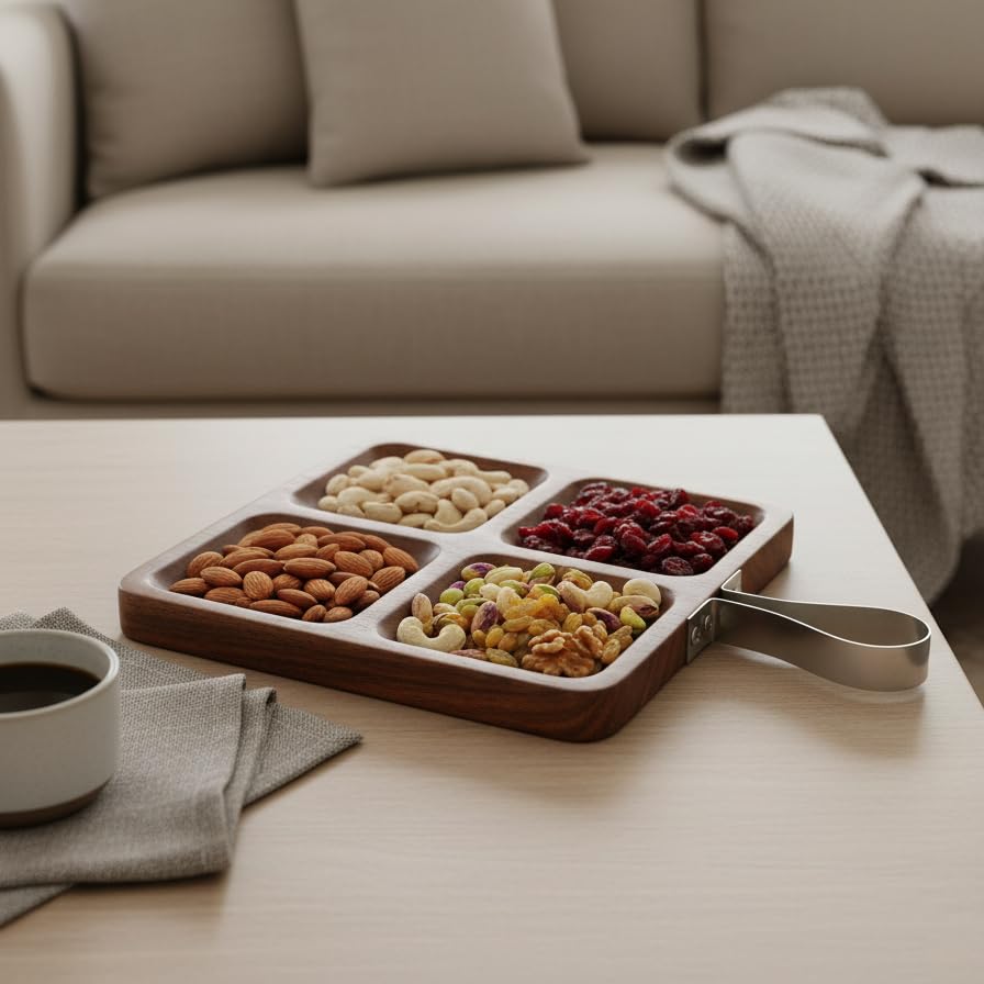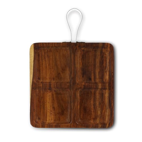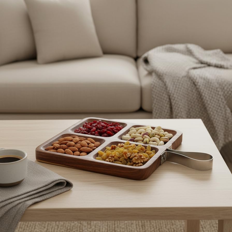 - التصميم: طبق تقديم خشبي مصنوع يدويًا يتميز بـ 4 مساحات تخزين مربعة ومقبض معدني أنيق، مثالي لتقديم المكسرات والوجبات الخفيفة والمقبلات