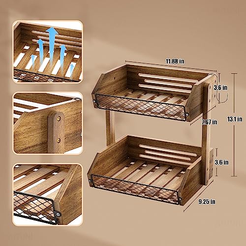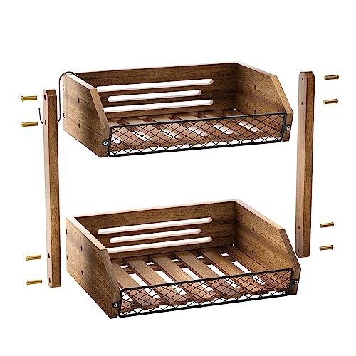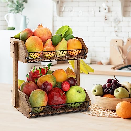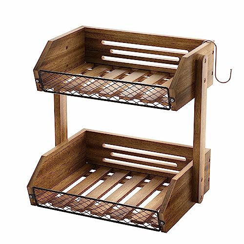 NUTUNI - سلة فاكهة للمطبخ من نوتوني وعاء طبقتين مع شماعة موز طاولة مطبخ خشبية اكاسيا تخزين الفواكه والخضروات للبطاطس والبصل والخبز والوجبات الخفيفة