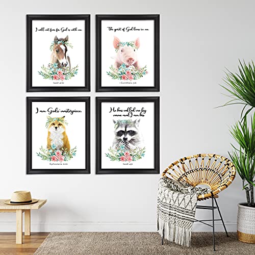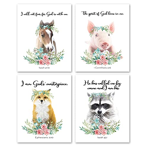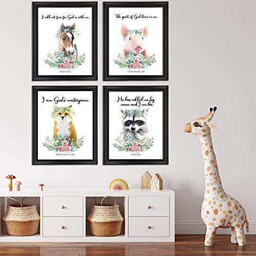 Nvhai - مطبوعات فنية جدارية بألوان مائية لحيوانات السفاري الصغيرة للأطفال مقاس 20 × 25 سم غير مؤطرة ومزينة بآيات من الكتاب المقدس لتزيين غرف البنات والأطفال والرضع من ان في هاي، 4 قطع