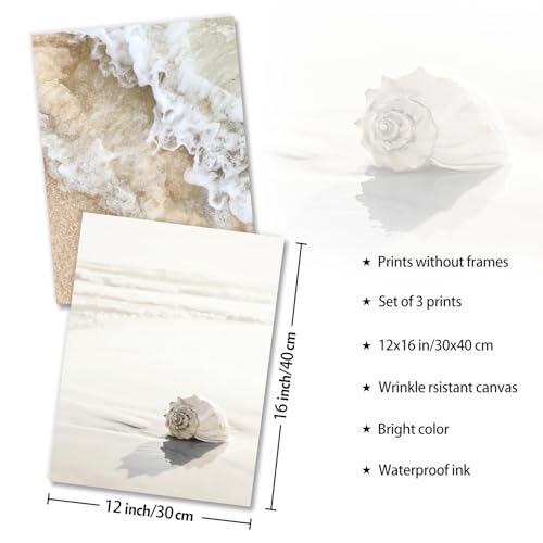 NymphFable - بوستر لتزيين الحائط بألوان محايدة بنمط الشاطئ من نيمف فابل طباعة أمواج المحيط والقواقع حائط ساحلي للحمام وغرفة المعيشة 30.5 × 40.6 سم مجموعة 3 قطع بدون إطار بيج