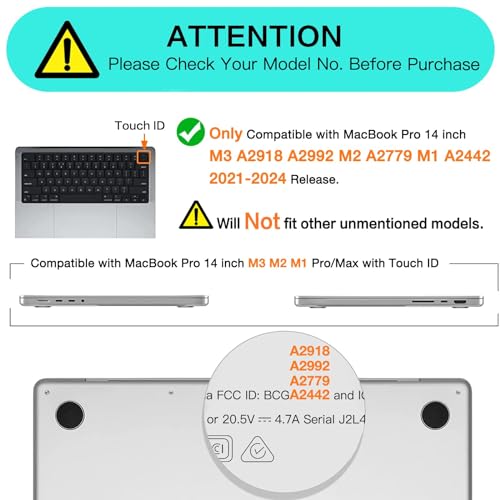 - [ متوافق]: هذه الحافظة متوافقة فقط مع ماك بوك برو 14 بوصة مع شريحة M1 برو / M1 ماكس وخاصية التعرف باللمس (الموديل: A2442، إصدار 2021). ملاحظة: غير مناسب لطراز آخر من ماك بوك.