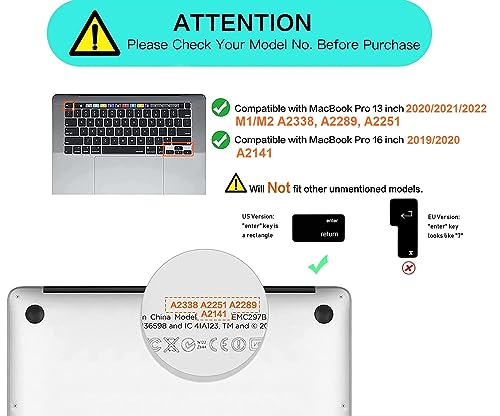 - ✔️[الإصدار]: - غطاء لوحة المفاتيح مناسب لجهاز ماك بوك برو 13 بوصة موديلات من 2020 إلى 2022 مع معالج آبل M1 M2 موديل A2338 (M1) A2289 A225 وماك بوك برو 16 بوصة إصدار 2020 و2019 موديل A2141 بشريط لمس وبمستشعر بصمة وبتصميم لوحة المفاتيح الأمريكي (ليس للموديلات الأخرى). يرجى التحقق من رقم طراز جهاز ماك بوك الخاص بك "Axxxx" في الجزء السفلي من اللاب توب.