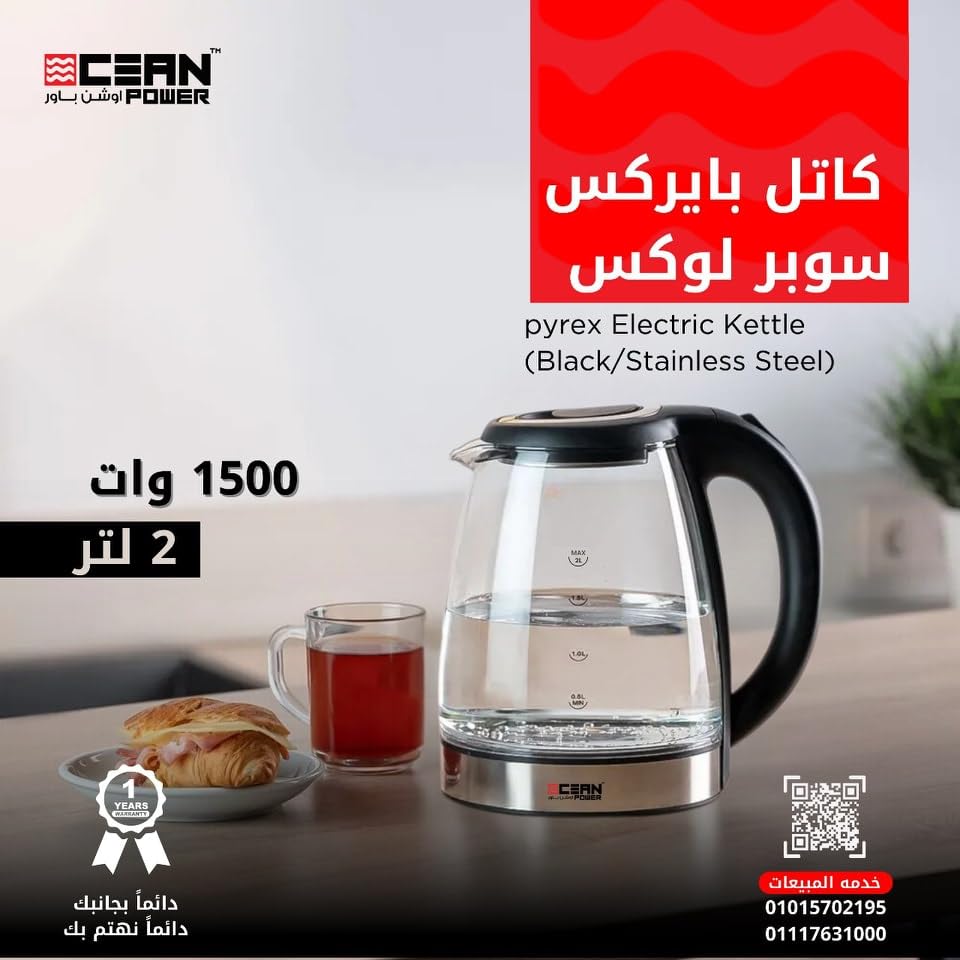 Generic - غلاية زجاج كهربائية سعة 2 لتر من اوشين بقدرة 1500 وات ظام حماية كامل مع إيقاف تلقائي زجاج بلوري شفاف مقاوم للحرارة ، غليان سريع وآمن مثالية للشاي والقهوة والمشروبات الساخنة سهلة التنظيف