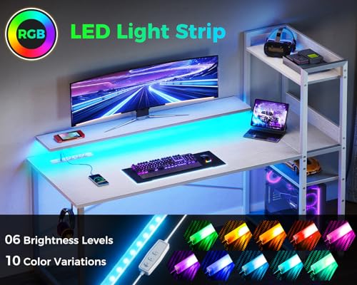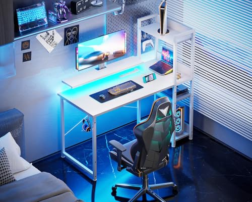 ODK - مكتب كمبيوتر مع منفذ شحن USB وفتحة كهرباء من او دي كيه كتابة بطول 1.1 متر رفوف تخزين ورف شاشة طاولة دراسة قابلة للعكس للمكتب المنزلي وغرف النوم الصغيرة بلون أبيض