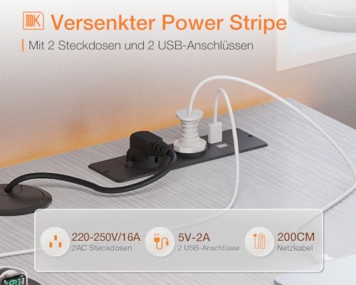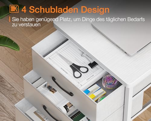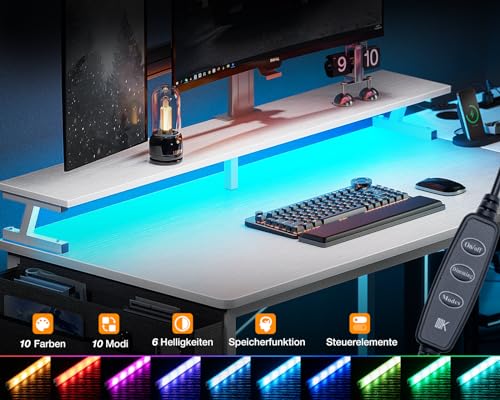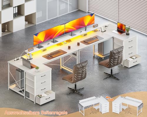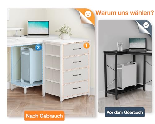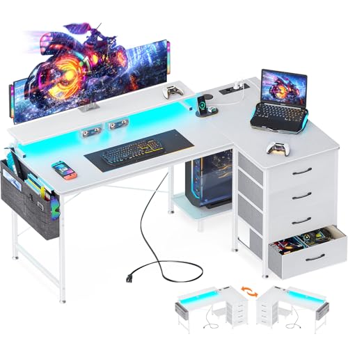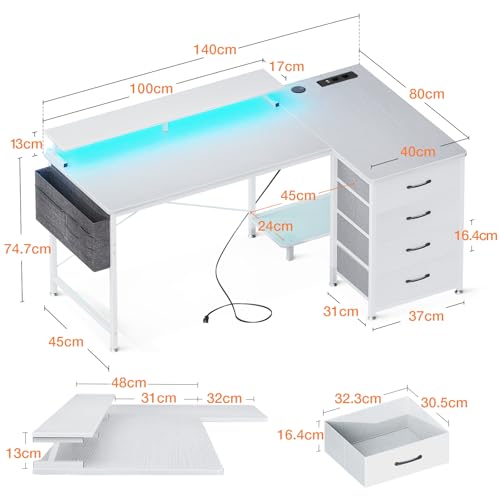 ODK - مكتب زاوية من او دي كيه بـ 4 أدراج قماشية، مكتب قابل للعكس على شكل حرف L بـ 2 مقبس ومنفذي شحن USB، طاولة ألعاب بإضاءة ليد وحامل شاشة للمكتب المنزلي (أبيض، 1.4 م × 80 × 85.9 سم)