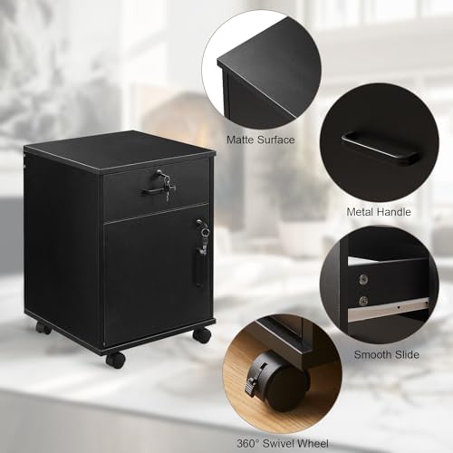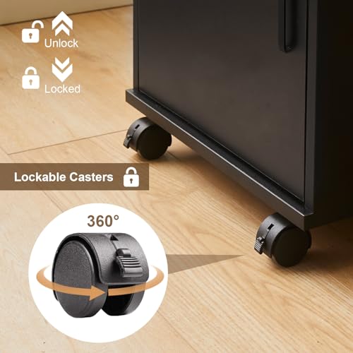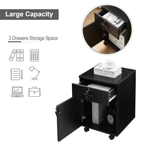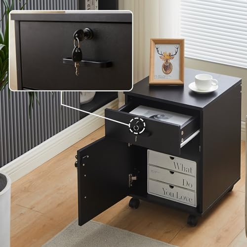 OFCASA - اوفكاسا خزانة ملفات مكتبية مع درج قابل للقفل وباب متحركة على عجلات دوارة من الخشب الاسود للمنزل والمكتب
