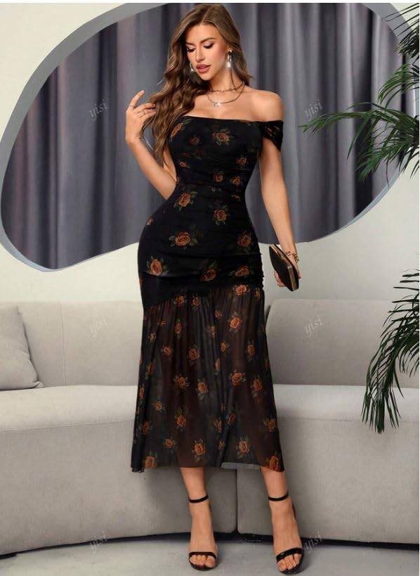 Generic - فستان ماكسي شبكي مكشوف الكتفين، اسود مع طباعة وردية، تصميم مكشكش