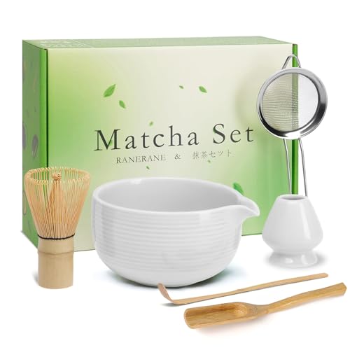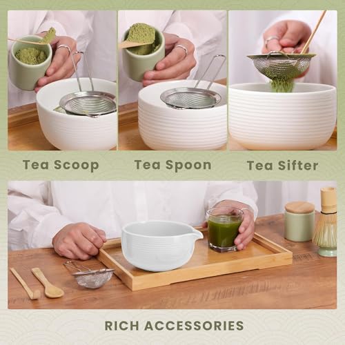 Ofrdncy - مجموعة خفاقة ماتشا - وعاء ماتشا وخفاقة ماتشا من الخيزران ومغرفة وملعقة ومنخل وحامل خفاقة، مجموعة مثالية للمبتدئين من 6 قطع لحفلات شاي الماتشا (ابيض)