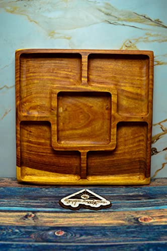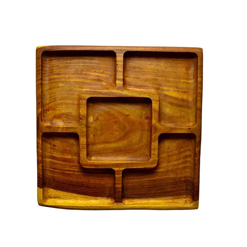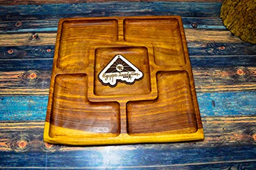Egypt Antiques - طبق وجبات خفيفة او تسالى مربع خماسي مقسم داخلي صناعة يدوية من الخشب الصحي الوان طبيعية 100% من قلب الشجرة، بني