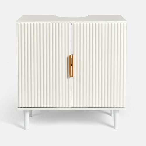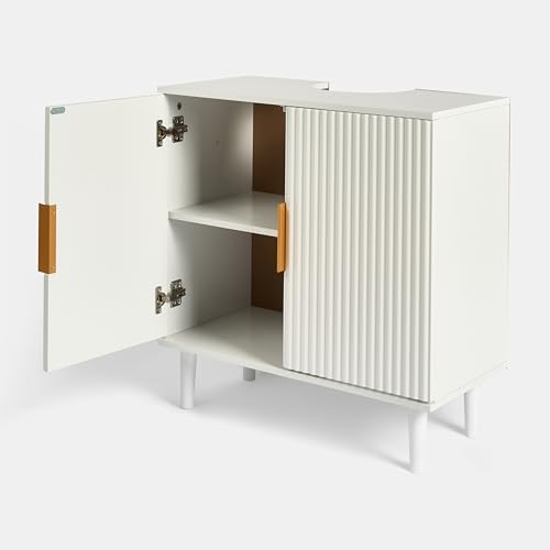 OHS - خزانة حمام توضع تحت الحوض بلون كريمي من او اتش اس، وحدة تخزين خشبية مضلعة قائمة بذاتها مع بابين ورف، خزانة حوض الحمام مع اقدام، 60 × 30 × 61 سم