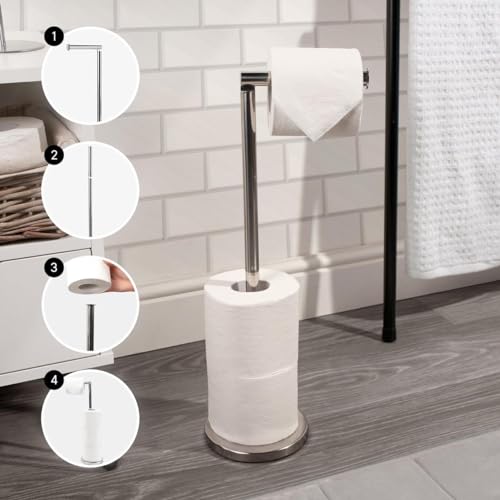 - حامل ورق التواليت قائم بذاته: يجمع حامل ورق التواليت المعدني الفضي بين الأناقة والعملية، مما يوفر مساحة تخزين ورق التواليت لما يصل إلى 4 لفات، مع طي على شكل حرف L يحمل لفة ورق واحدة للاستخدام.