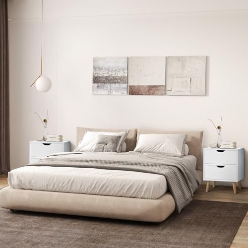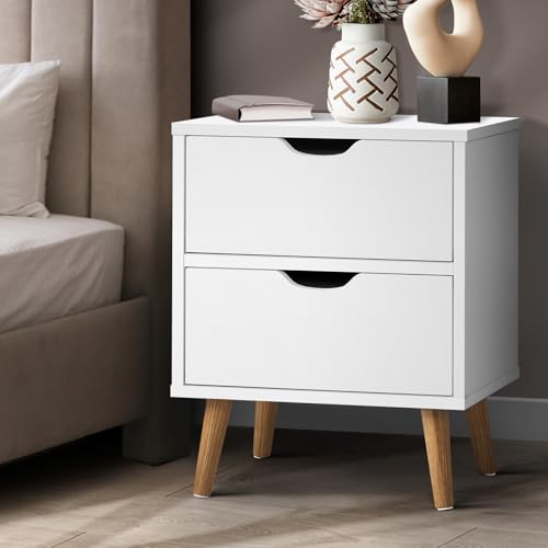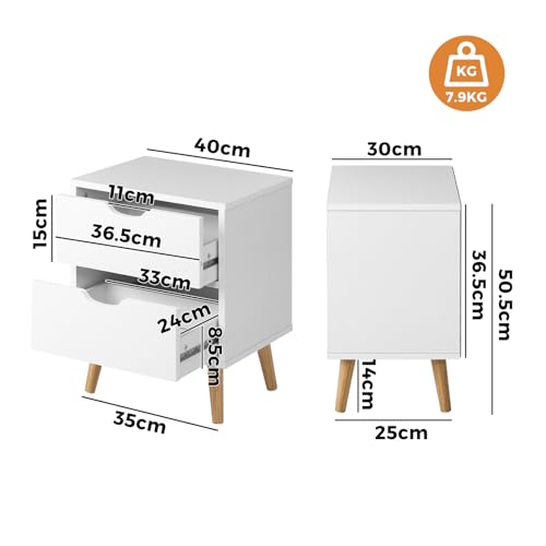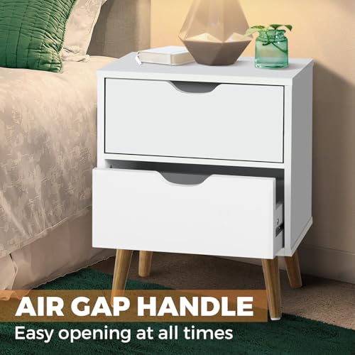 OIKITURE - طاولة جانبية للسرير مع درجين، دولاب تخزين وطاولة جانبية خشبية من اويكيتشر، أبيض