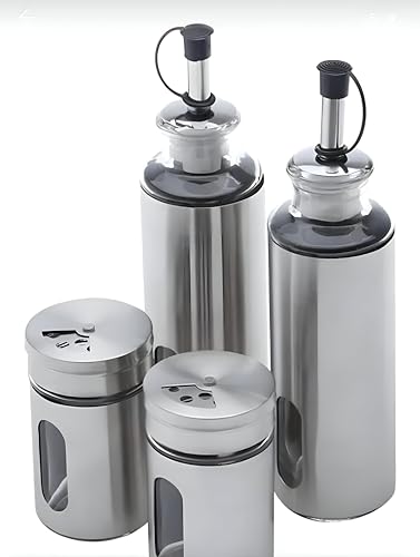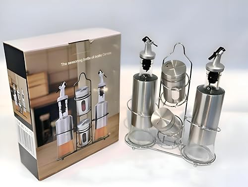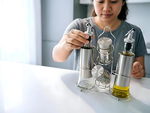 Generic - موزع زيت وخل مكون من زجاجتين من الزجاج سعة كل منهما 300 مل وحامل من الفولاذ المقاوم للصدأ وحاويتين ملح لتناول الطعام بأناقة