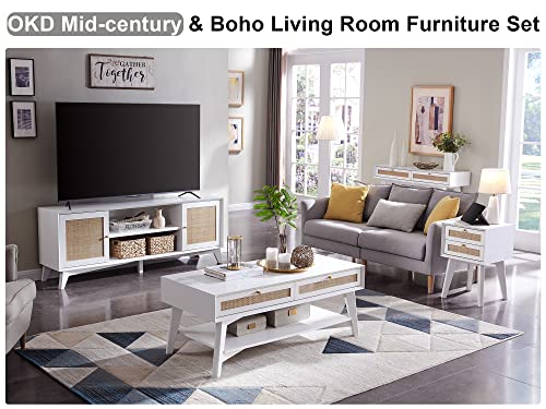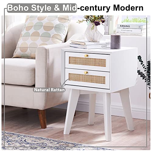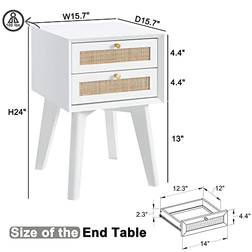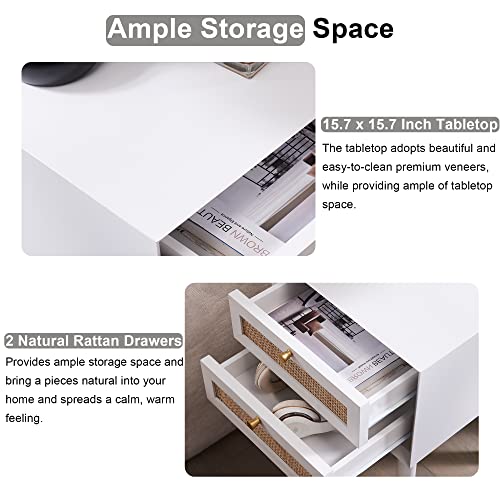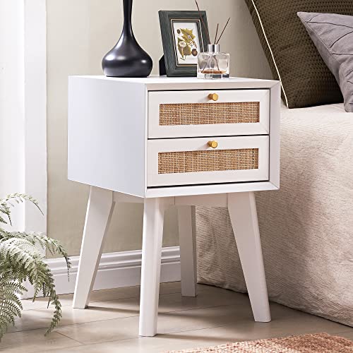 OKD - ترابيزة سرير عصرية من الراتان او كيه دي مع درجين للتخزين جانبية خشبية بنمط بوهيمي بمقاس صغير للأريكة لغرفة النوم وغرفة المعيشة أبيض مقاس 39.87 سم خشب مصمم