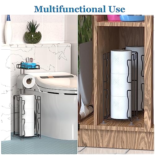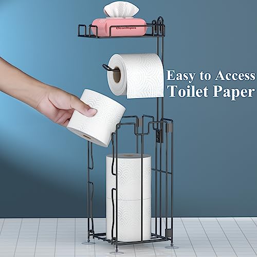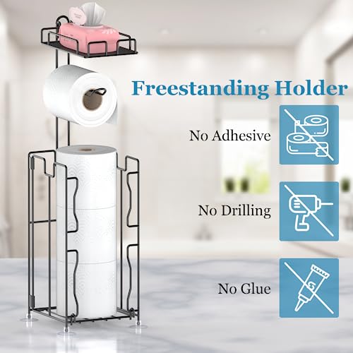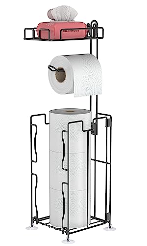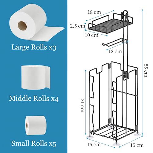 Okiuen - حامل ورق تواليت قائم من اوكيوين، بدون ثقب، حامل رول بديل للبكرات الكبيرة، حامل لفافة تواليت 3 في 1، قائم بذاته، لون أسود مع رف للمناديل المبللة/ الموبايل