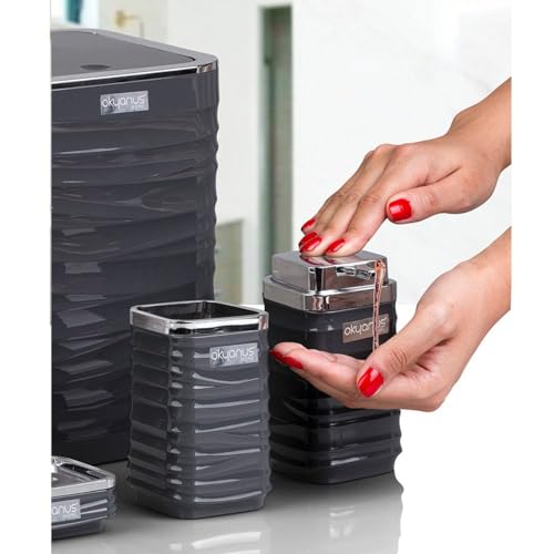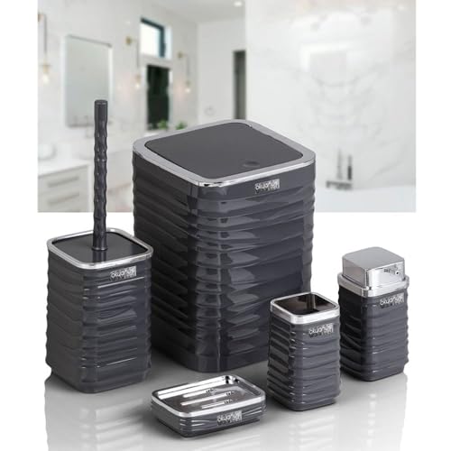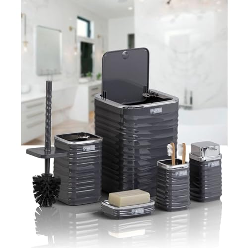 okyanus home - طقم حمام مربع 5 قطع من لونا (طبق صابون، موزع صابون، سلة مهملات، فرشاة تواليت وحامل، وحامل فرشاة أسنان) غطاء كروم (رمادي)